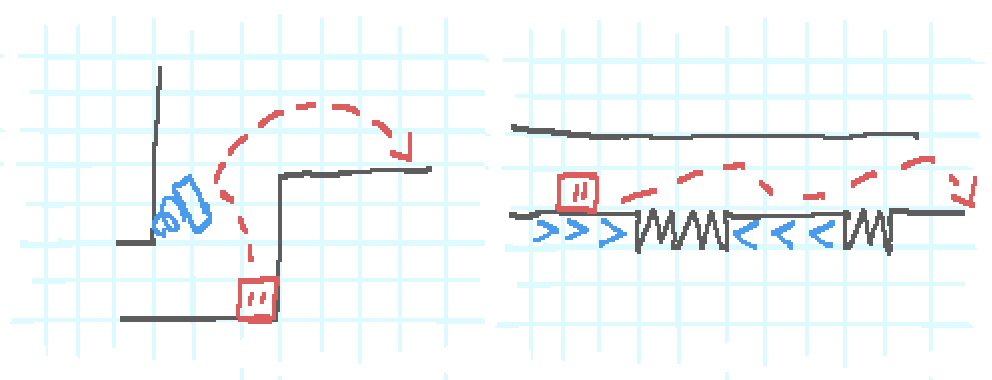 But I was having trouble figuring out what exactly these "puzzles" would be. In my mind, a lot of the games interest would come from having to swap between conflicting actions, for example, going left and right at the same time cancel each other out and you end up going nowhere. What I didn't realize until later though is that left and right were the only actions you really needed to toggle on and off. Jumping worked in tandem with both of them, and beyond that there isn't really anything else mechanically inherent to platformers. I tried to get more variety by adding a dash to go along with your jump. A dash jump would go farther than a normal jump, but not as high, and a dash on it's own could be used to navigate areas with low ceilings.